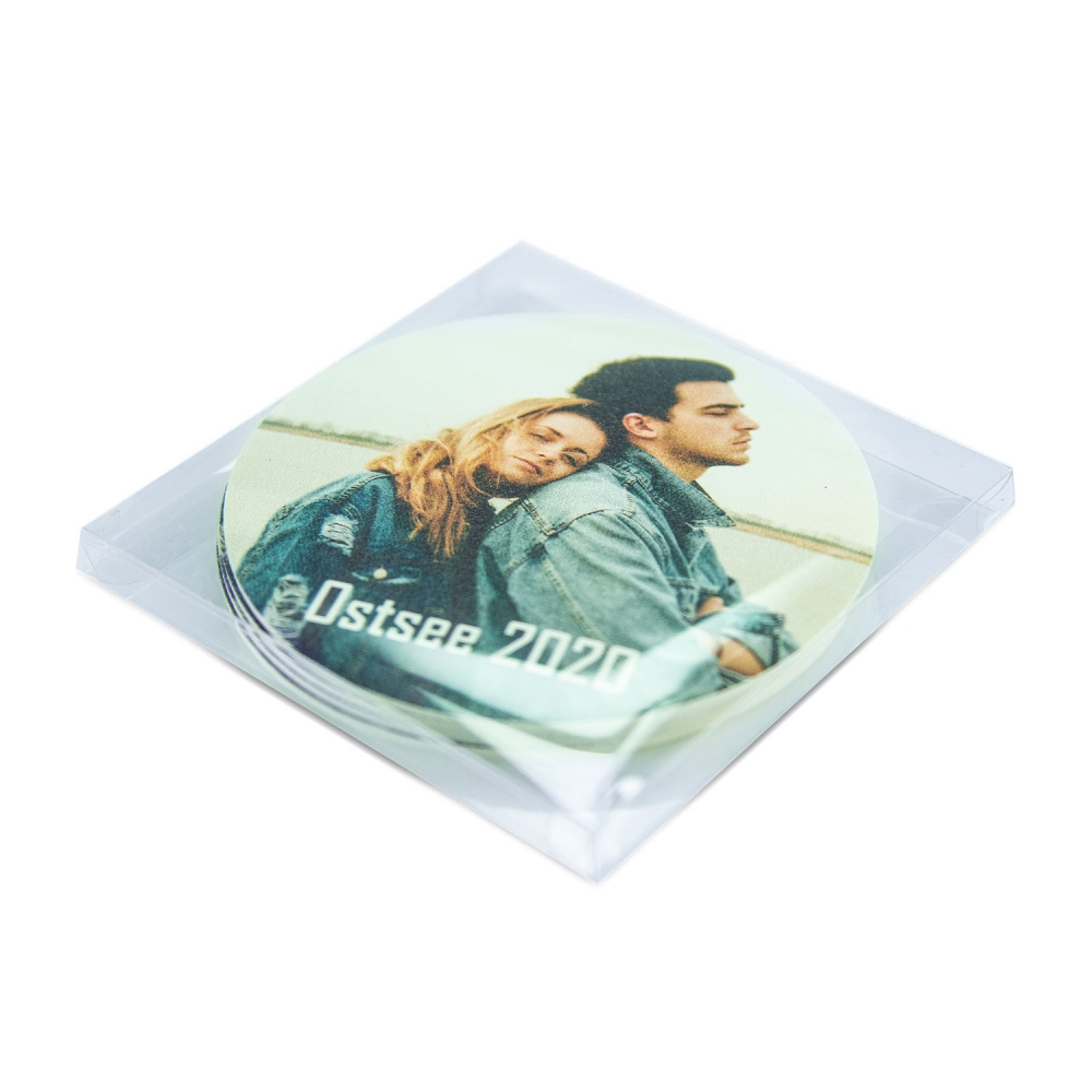 Runde, dekorative Untersetzer für Trinkgläser, Flaschen und Tassen werden mit einem Foto Deiner Wahl bedruckt. Dein Tisch wird unverwechselbar aussehen, egal ob die Untersetzer Porträts, Urlaubs- oder Tierfotos zeigen.