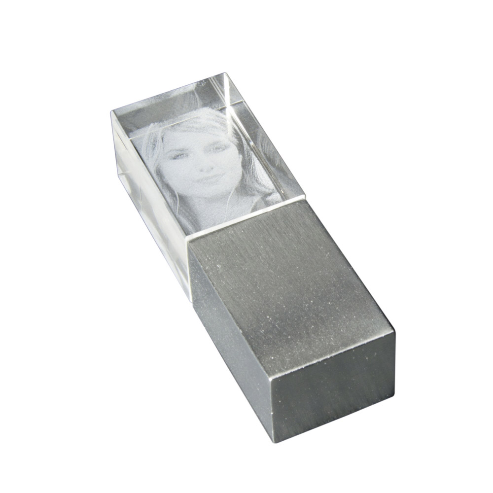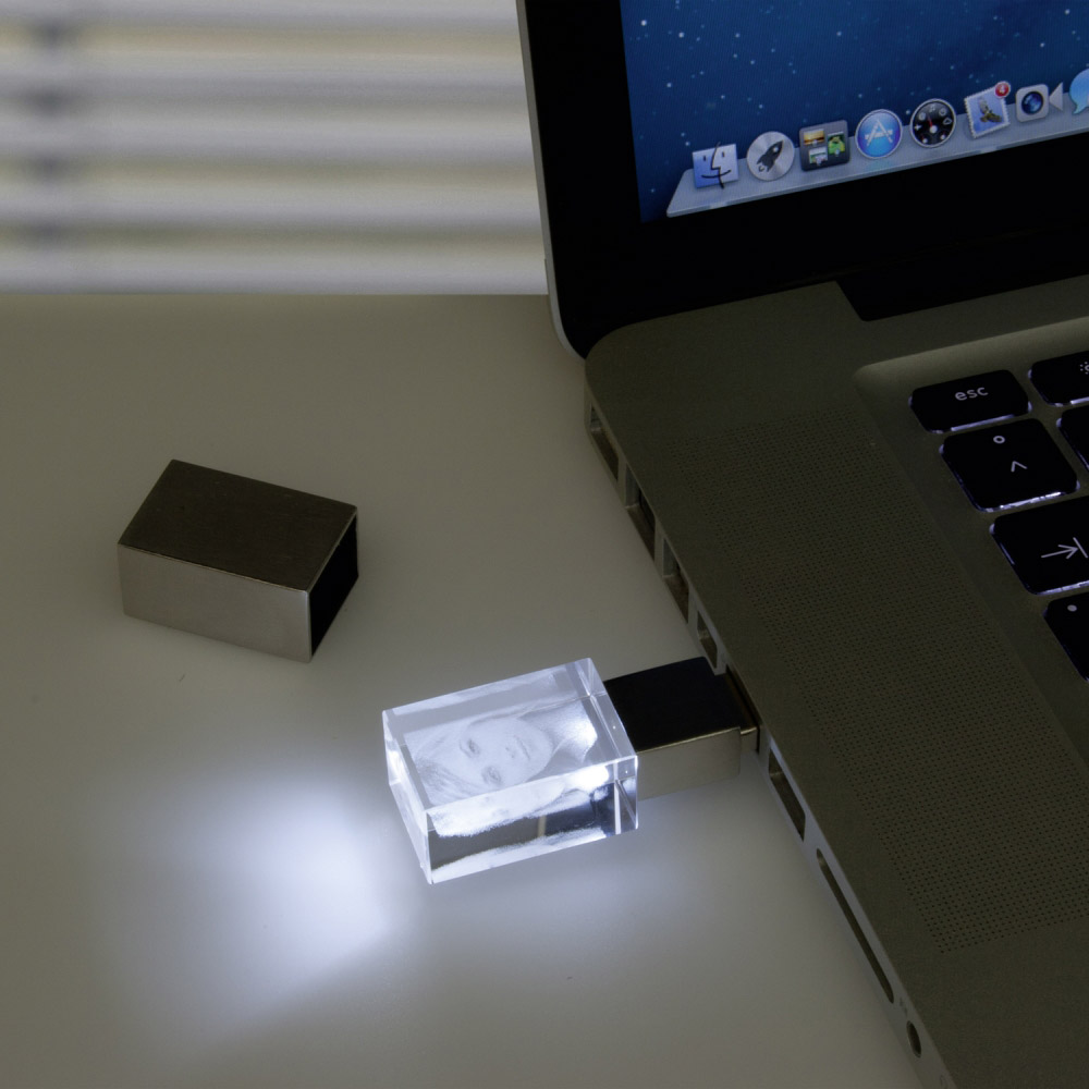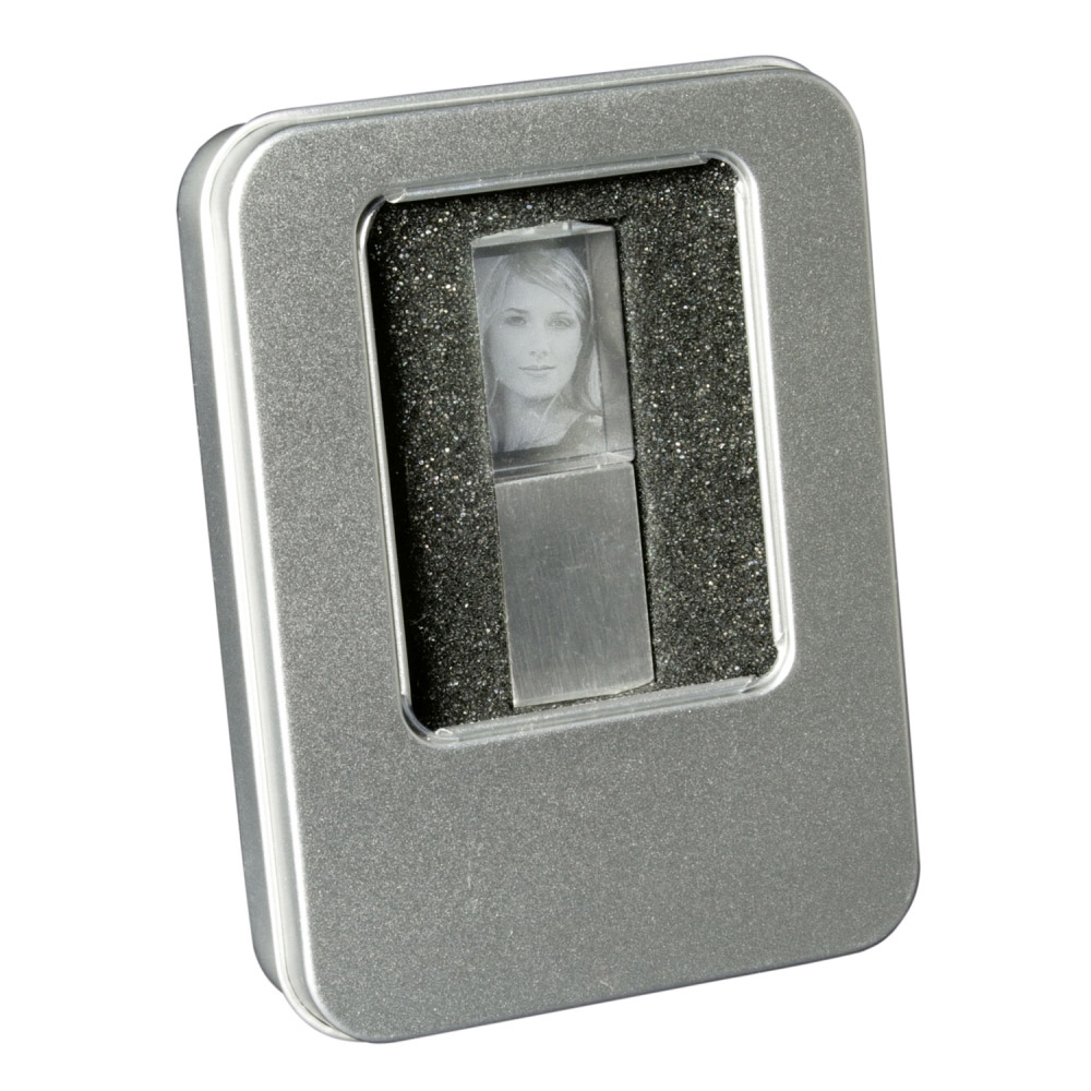 Der mit einer Fotolaserung verzierte USB-Stick ist ein Geschenk von hohem exklusiven Wert. Das Glasteil ist aus erstklassigem Kristallglas gefertigt. Wir lasern Ihr Wunschfoto mitten ins Glas. Das Glas wird mit weißem LED-Licht beleuchtet, sobald Sie den USB-Stick in den Rechner einstecken. Der USB-Stick bietet einen Speicherplatz von 16 GB. Der Glasfoto-USB-Stick kommt in einer edlen Metallbox mit Sichtfenster. Der USB-Stick ist sicher in schwarzem Schaumstoff eingebettet und wird in dieser schönen Geschenkbox aufbewahrt.